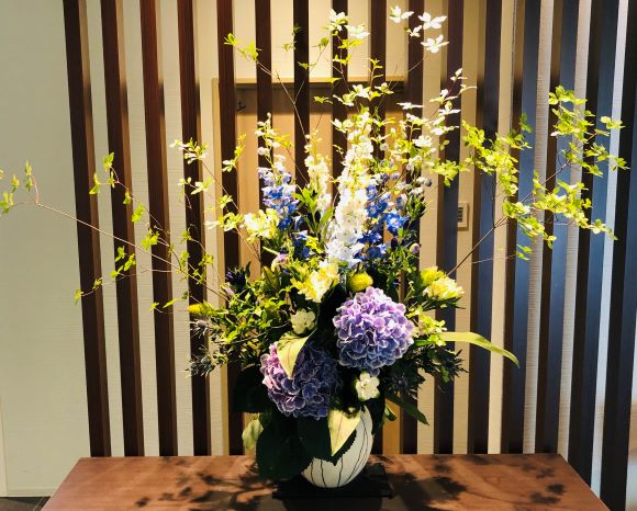 暑さを乗り切れそうな寒色系のアレンジメントになっております。